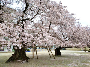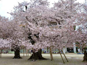 真鍋小学校の校庭中央に咲くソメイヨシノ。