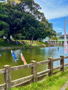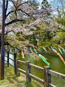 こいのぼりと桜が一緒に楽しめる亀城公園での一枚。桜とこいのぼりが春の風に揺れていました。
