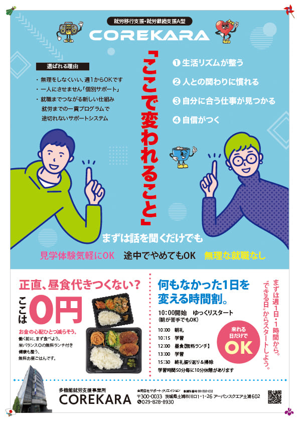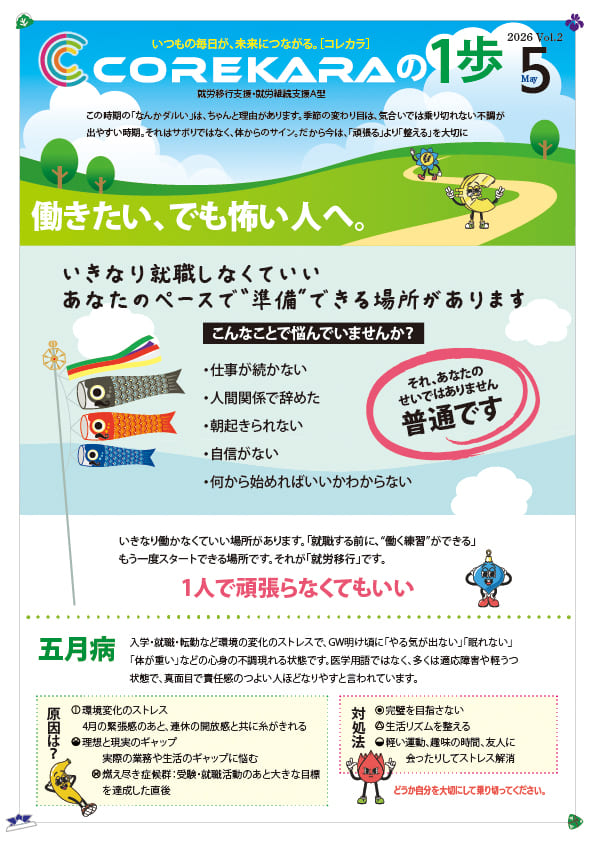 【COREKARAの一歩 Vol.2|5月号】 2026.04.14 季節の変わり目は、 気合いでは乗り切れない不調が出やすい時期。 だから今は、 「頑張る」より「整える」を大切に。 COREKARAでは、 自分のペースで“働く準備”ができる場所を大切にしています。 「ここで変われること」を一つずつ。 まずは、話を聞くだけでも大丈夫です。 見学・体験もお気軽にご相談ください。 ダウンロードはこちらから 鯉のぼりと桜 前の記事